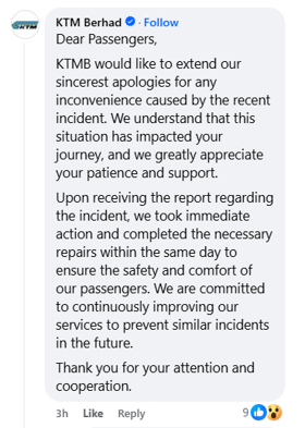 针对这起事件,马来亚铁道公司(KTMB)在男子视频下留言,对乘客带来的不便深感歉意,并表示维修工作已完成。