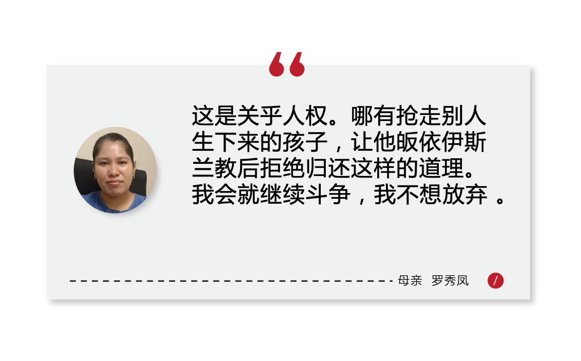 罗秀凤得知孩子下落后,就不断找机会前往探访孩子,但不断被当局以各种理由阻止。据说,孩子甚至表明自己已经是穆斯林,不想要离开,因为如果他们跟随母亲的话,他们说父亲会因此自杀。