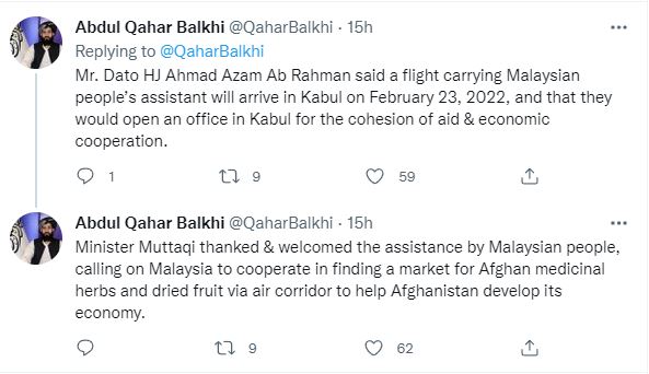 然而,阿富汗外交部发言人巴基(Abdul Qahar Balkhi)却在推文下透露,大马将在2月23日(周三)派出团队到首都喀布尔(Kabul),透过增设办公室加强人道和经济相关的合作。