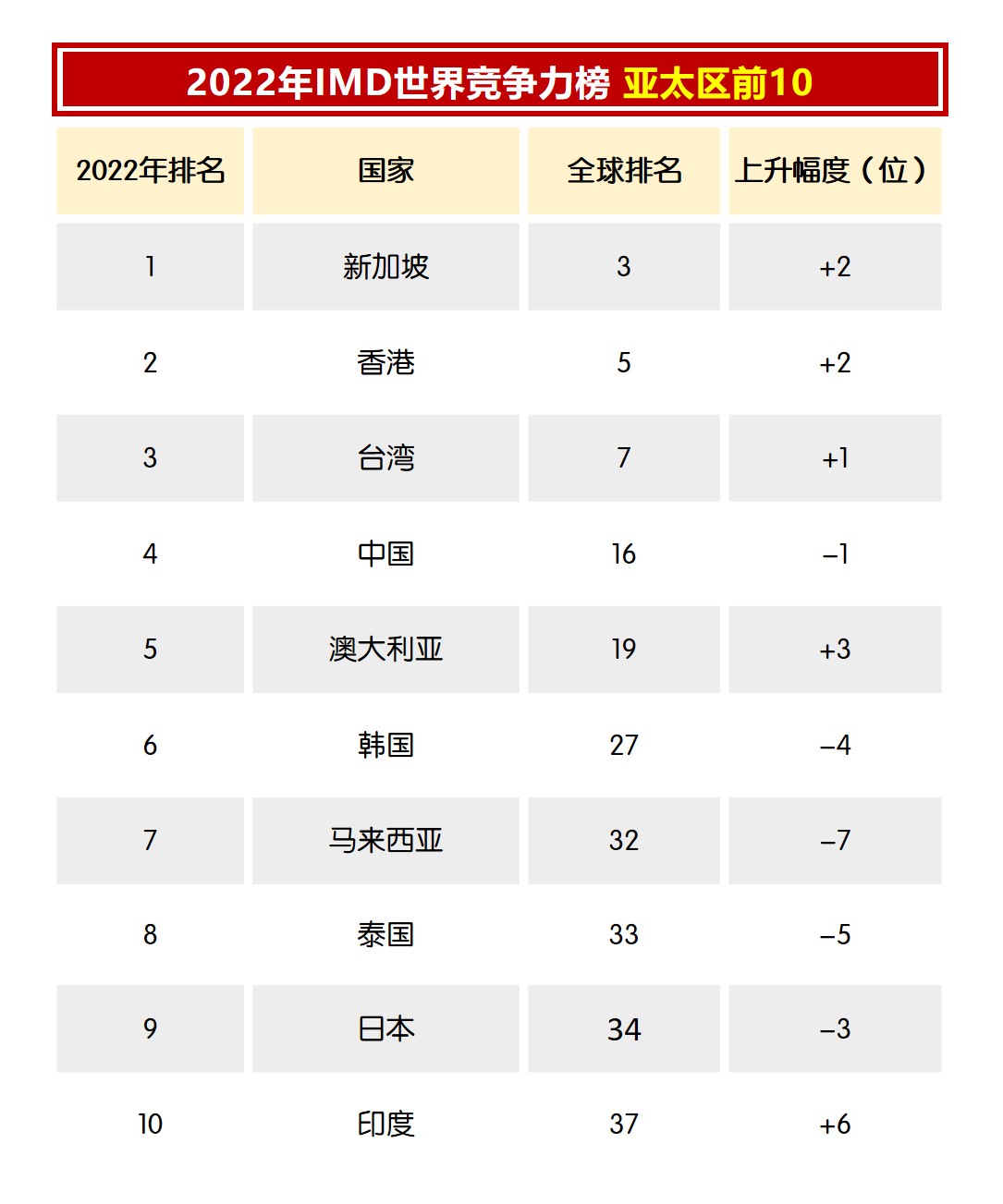 经过新冠疫情来袭,2022年国际管理发展学院(IMD)世界竞争力排名出炉!我国排名不上反跌,下滑7位,排名第32。至于邻国新新加坡,则从第5位上升到第3位,在亚太地区排名最高。
