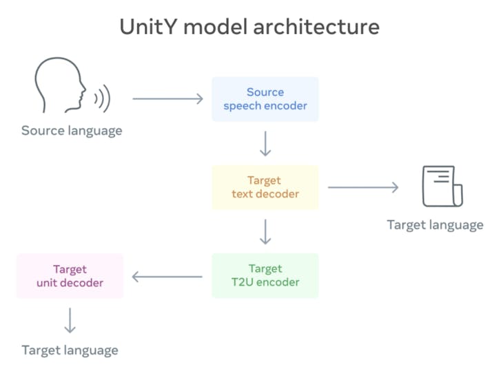 在这项新科技内,Meta使用了语音到单元翻译(Speech to Unit Translation/S2UT)技术,也就是将输入的语音翻译成一系列声学单元,然后从这些单元中生成波形。随后,再将二次解码机制采用UnitY,让第一阶段的解码器产生相关语言的文字,然后让第二阶段的解码器制作单元。