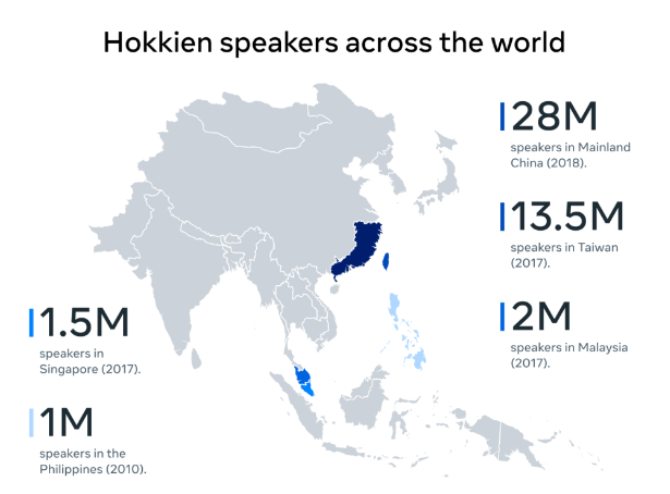Meta会选择闽南语(福建话),因为闽南语(福建话)的使用人口超过5,000万人,同时也是中文语系种的代表语言之一。不过福建话并没有成熟且系统化的文字记载,无法透过一般翻译技术转换成其他语言。