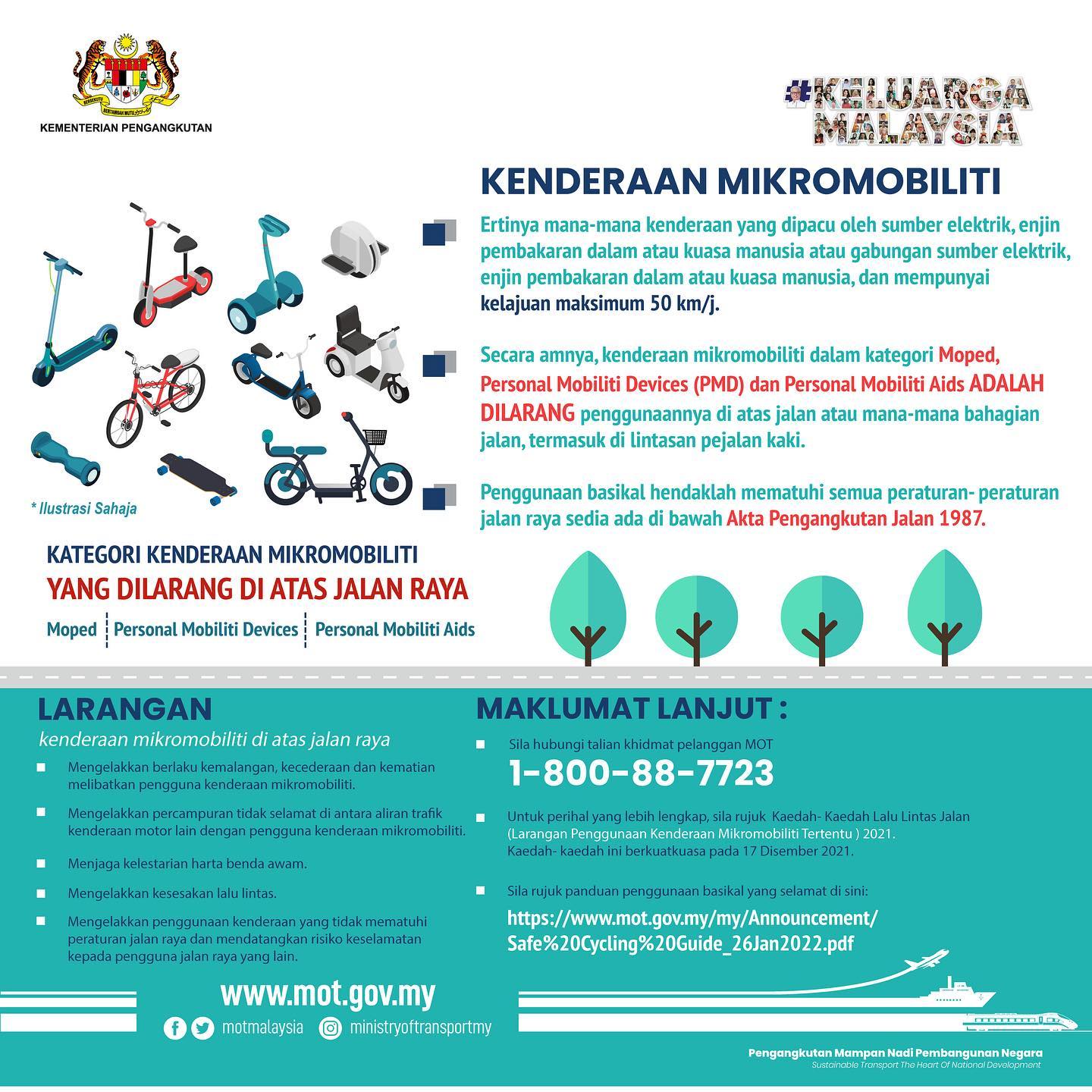 有鉴于此,他说,随着去年12月17日颁布的2021年道路交通条规(禁止使用微型交通工具),特定的微型交通已被禁止上路行驶,当中包括: