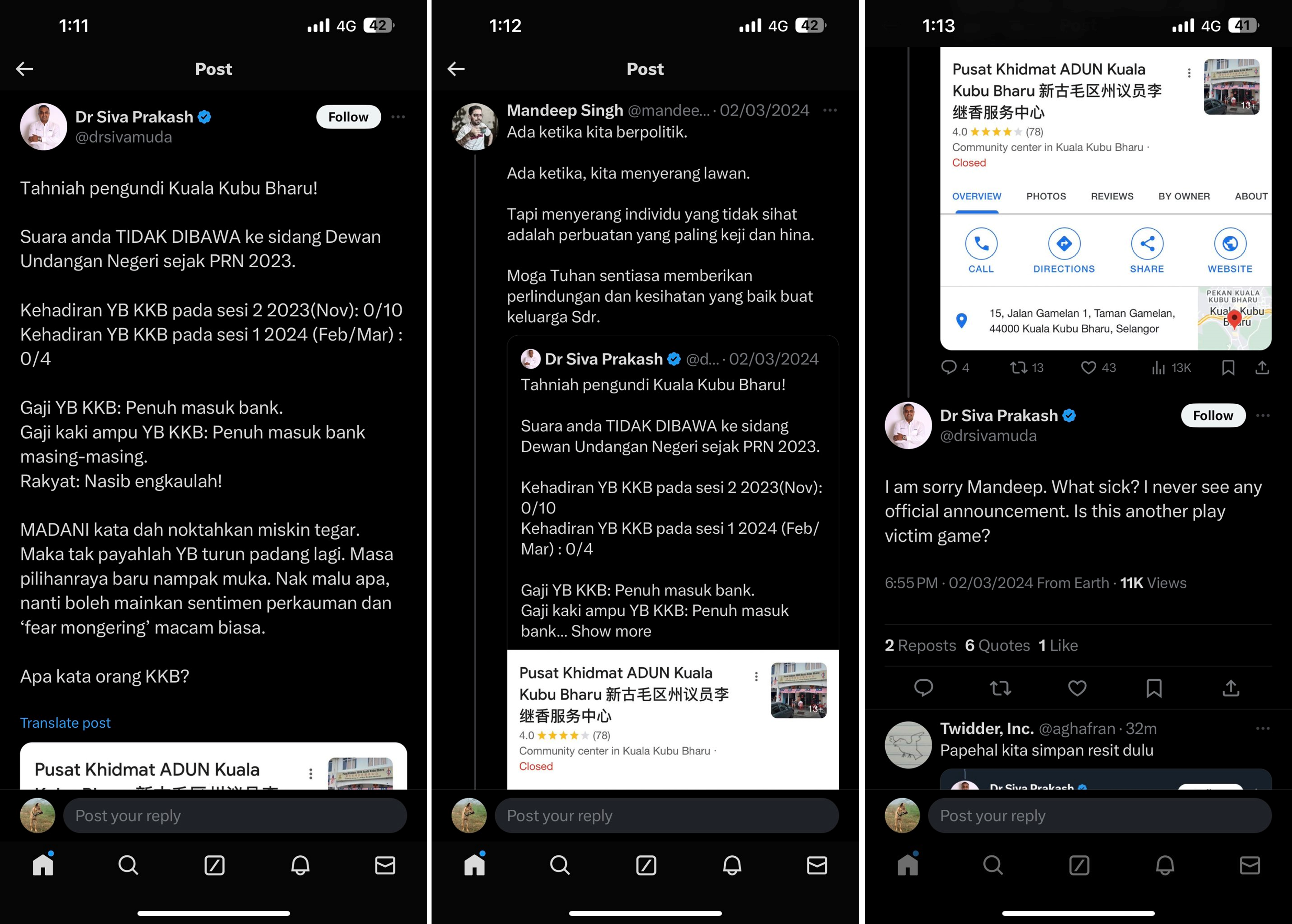 根据网民的截图,西瓦曾在3月2日,张贴新古毛区服务中心关闭的照片,揶揄李继香没有尽人民代议士的职责,指后者薪水照拿,但没有把人民的声音带入雪州议会。