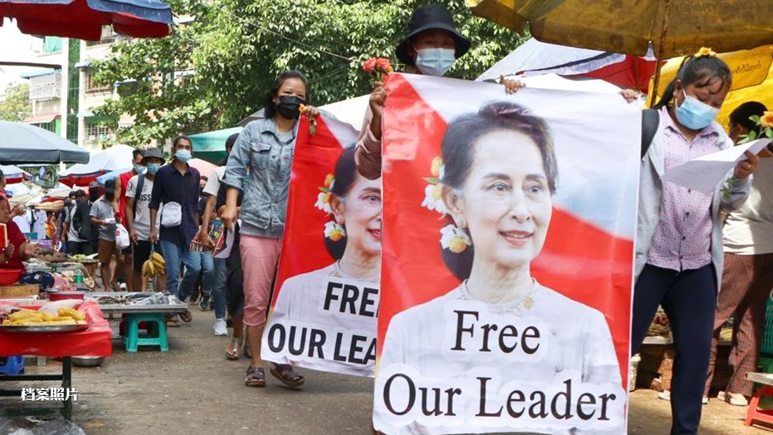 缅甸民众拿着“释放昂山素季”的横幅游走。