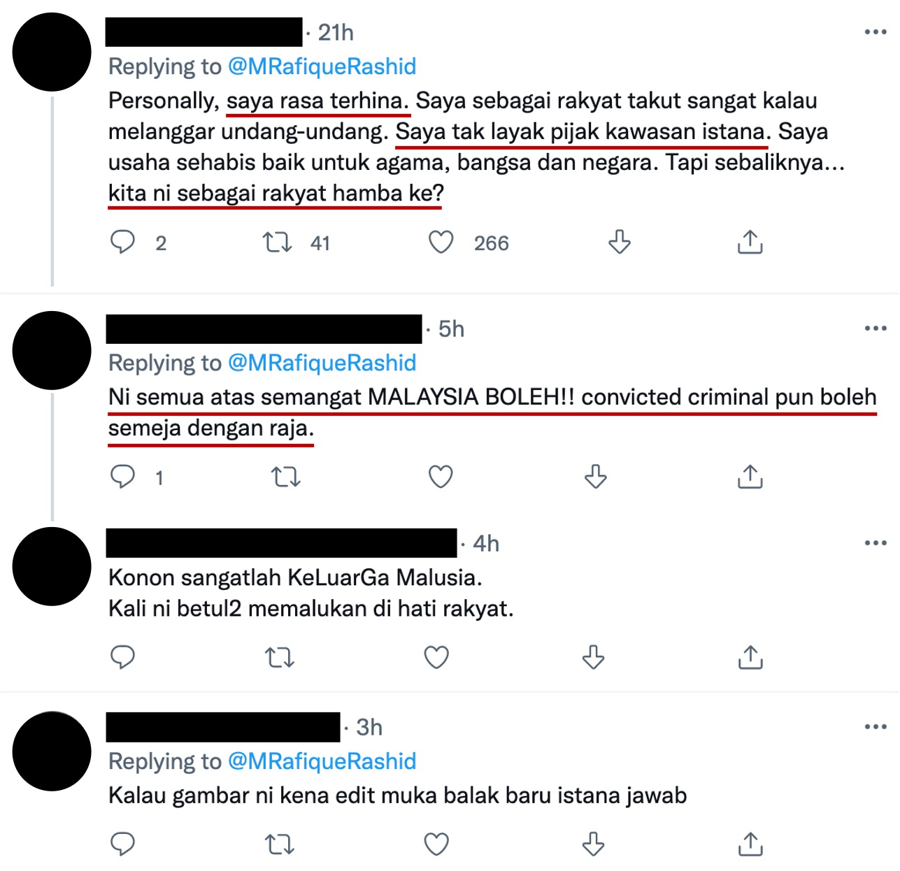其中一位网名认为自己被侮辱了。他说,因为身为普通平民的他没有资格踏入王宫土地,但一名罪犯却可以登台与元首用餐,他更嘲讽说道:“莫非身为人民的我们是奴隶吗?”