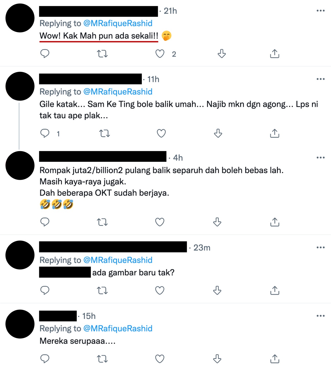 该帖文获得网民极力回响,并获得至少2,000次转发。几乎所有在帖文底下留言的网民,都对纳吉与元首同台用餐一事觉得很感冒。