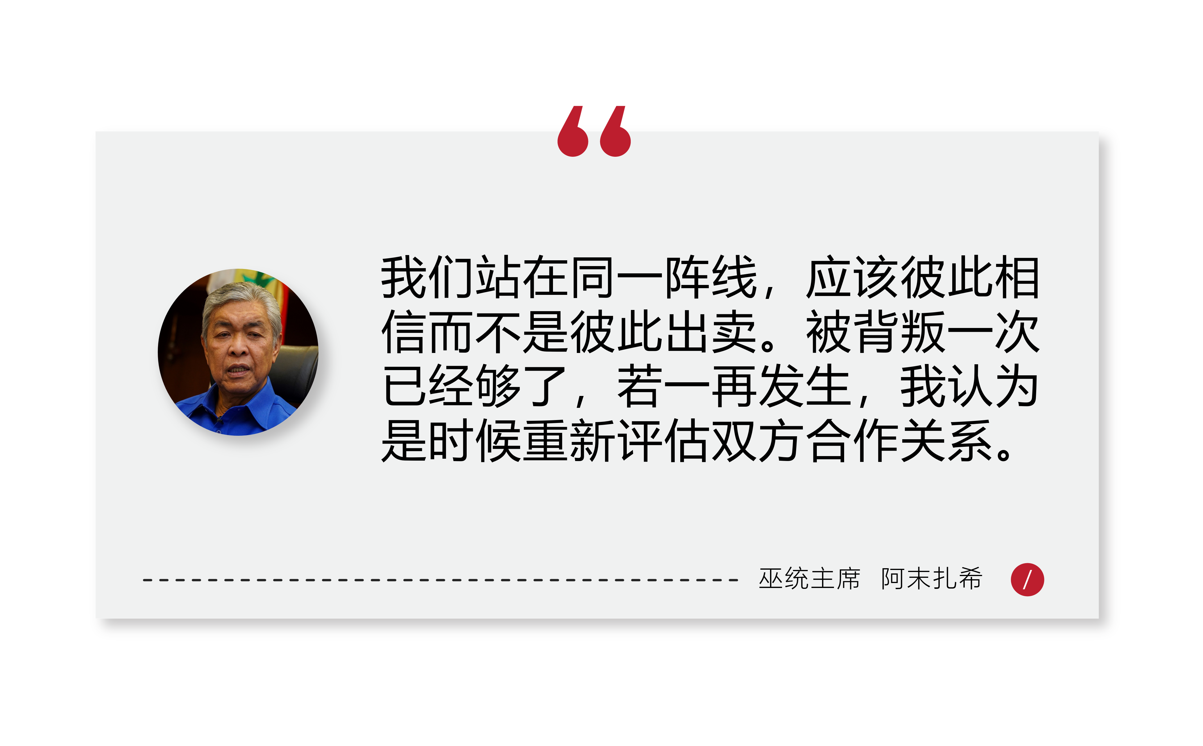 昨天晚上,巫统主席阿末扎希在一场线上访谈中,又再次对巫统和伊党之间的合作关系,撂下狠话。他表示,如果两党选择在同一条船上共生死,就应该互相信任,而不是背叛对方。扎希更放话,表示将重新检讨两党的合作关系。