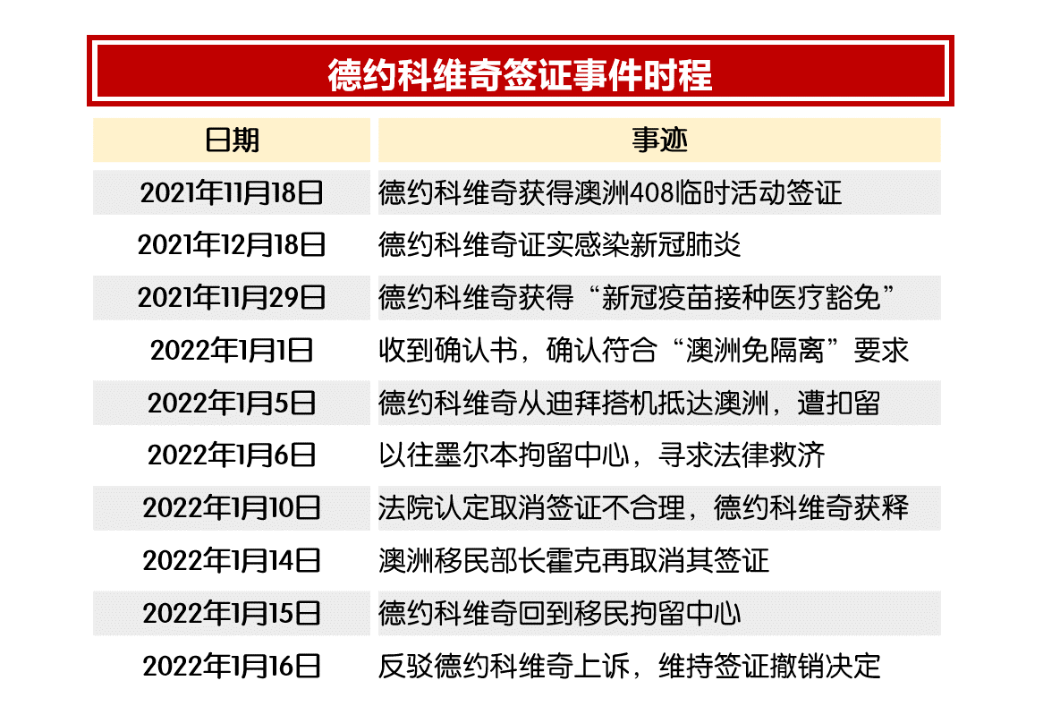 但澳洲法院认为取消签证的做法并不合理、下令放人,让德约科维奇重回赛场上。然而,就在比赛前夕,澳洲移民部长霍克(Alex Hawke)动用行政裁量权,再度取消德约科维奇的签证。