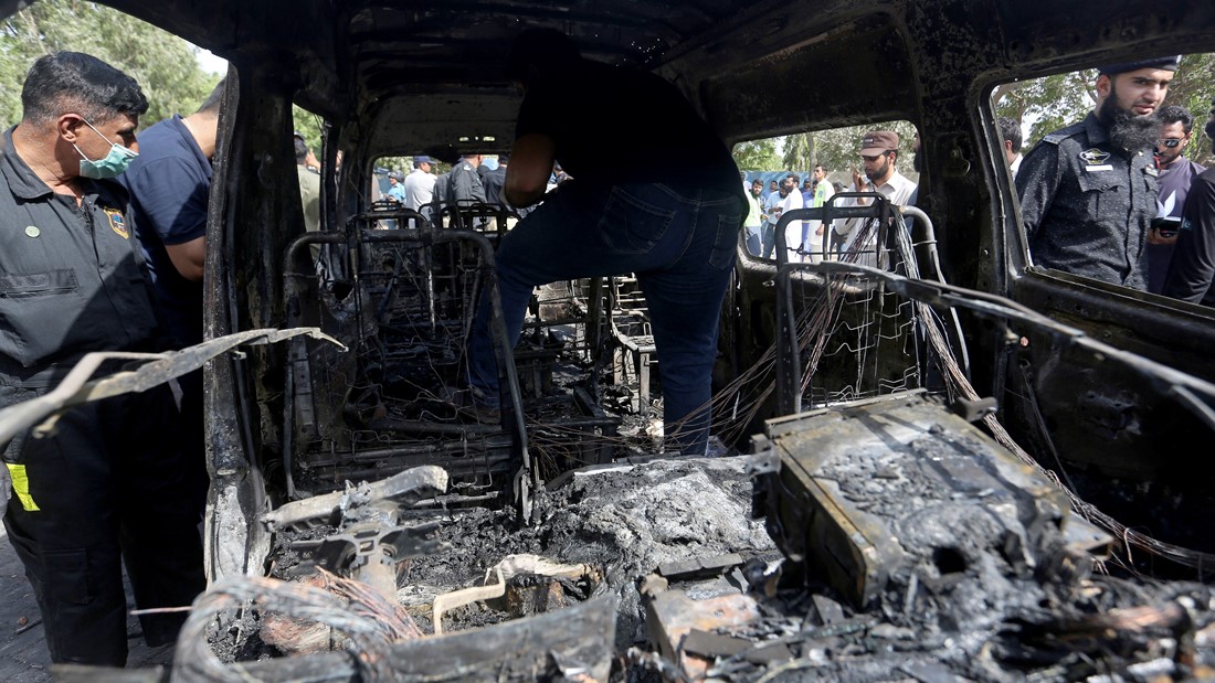 巴基斯坦当局对被炸毁的小型面包车进行调查。