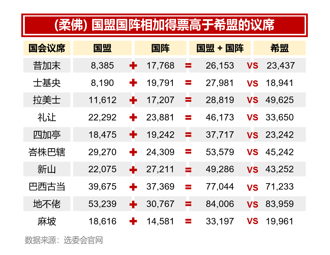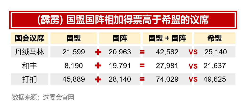 同样在和丰国席,希盟赢下21,637 票,但国盟和国阵相加的总票数达27,981张,高于希盟的得票数。