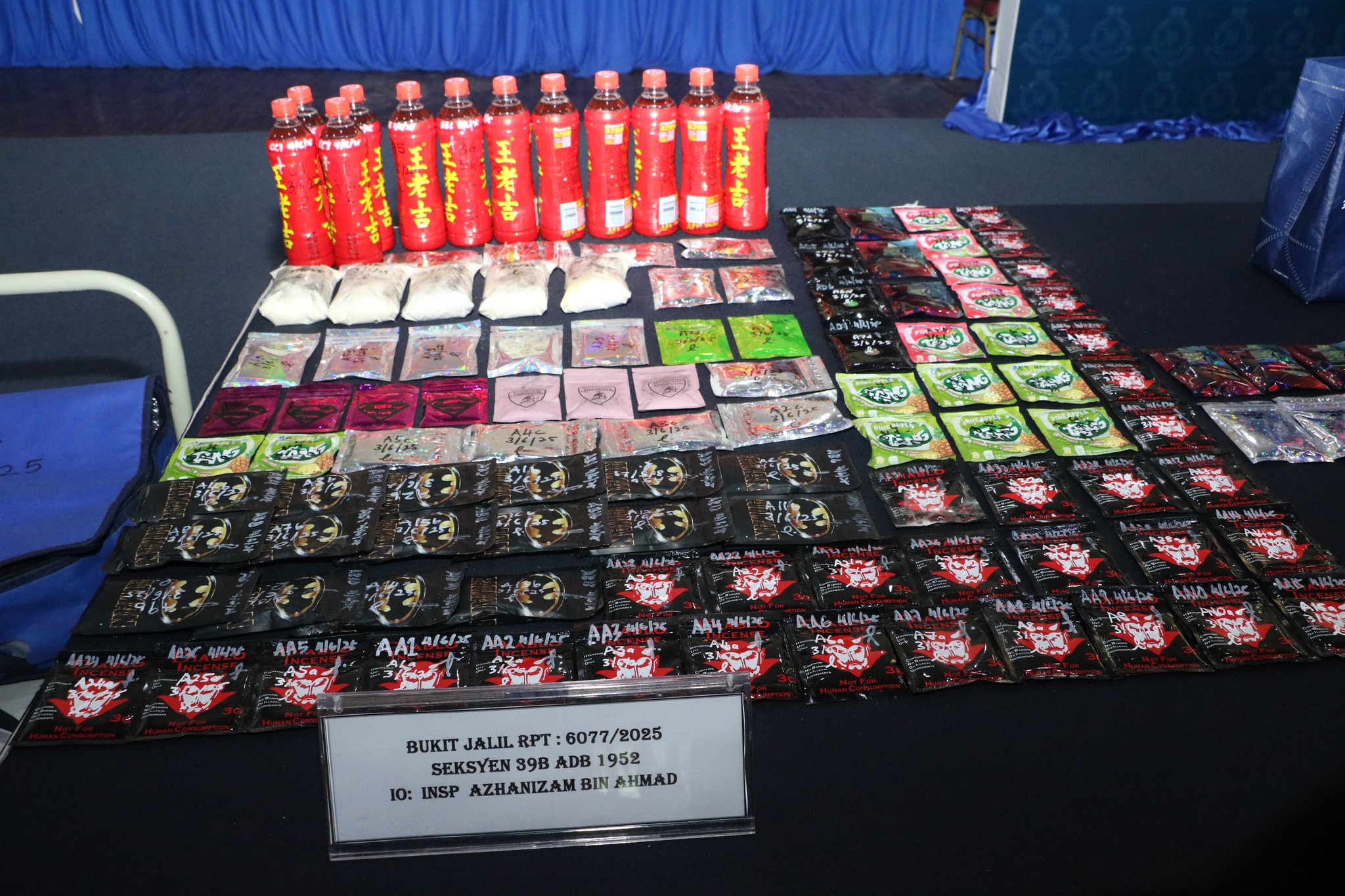 雪州总警长胡申今天在记者会上表示,警方经过长达2个月的情报收集工作后,于6月3日执行代号为“黑板树行动”(Ops Alstonia),在雪隆5个地区展开收网行动。胡申披露,警方在此次行动中,成功起获超过逾34公斤的毒品,包括摇头丸粉末、含毒果汁饮品、摇头丸、电子烟弹、氯胺酮以及5仔等毒品。