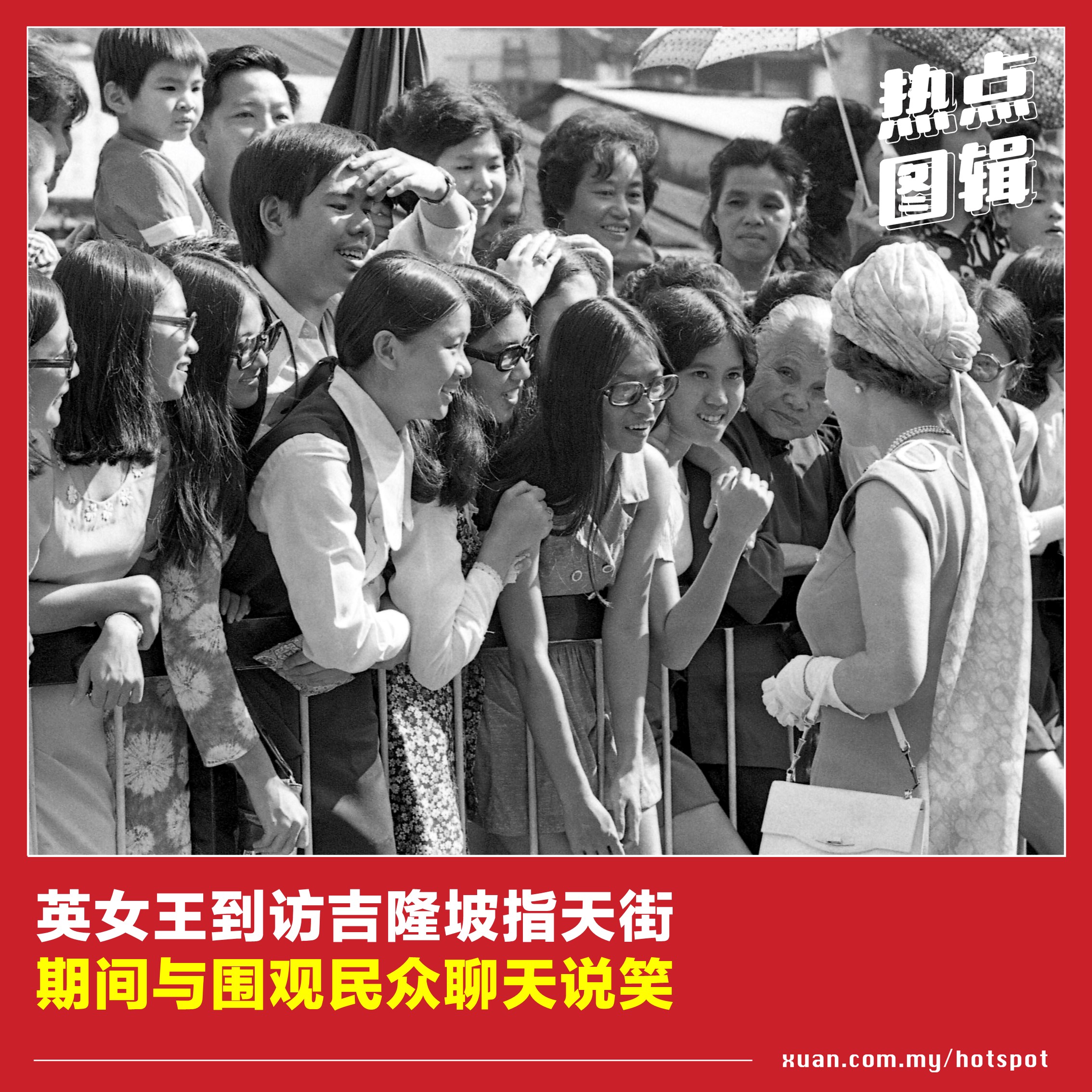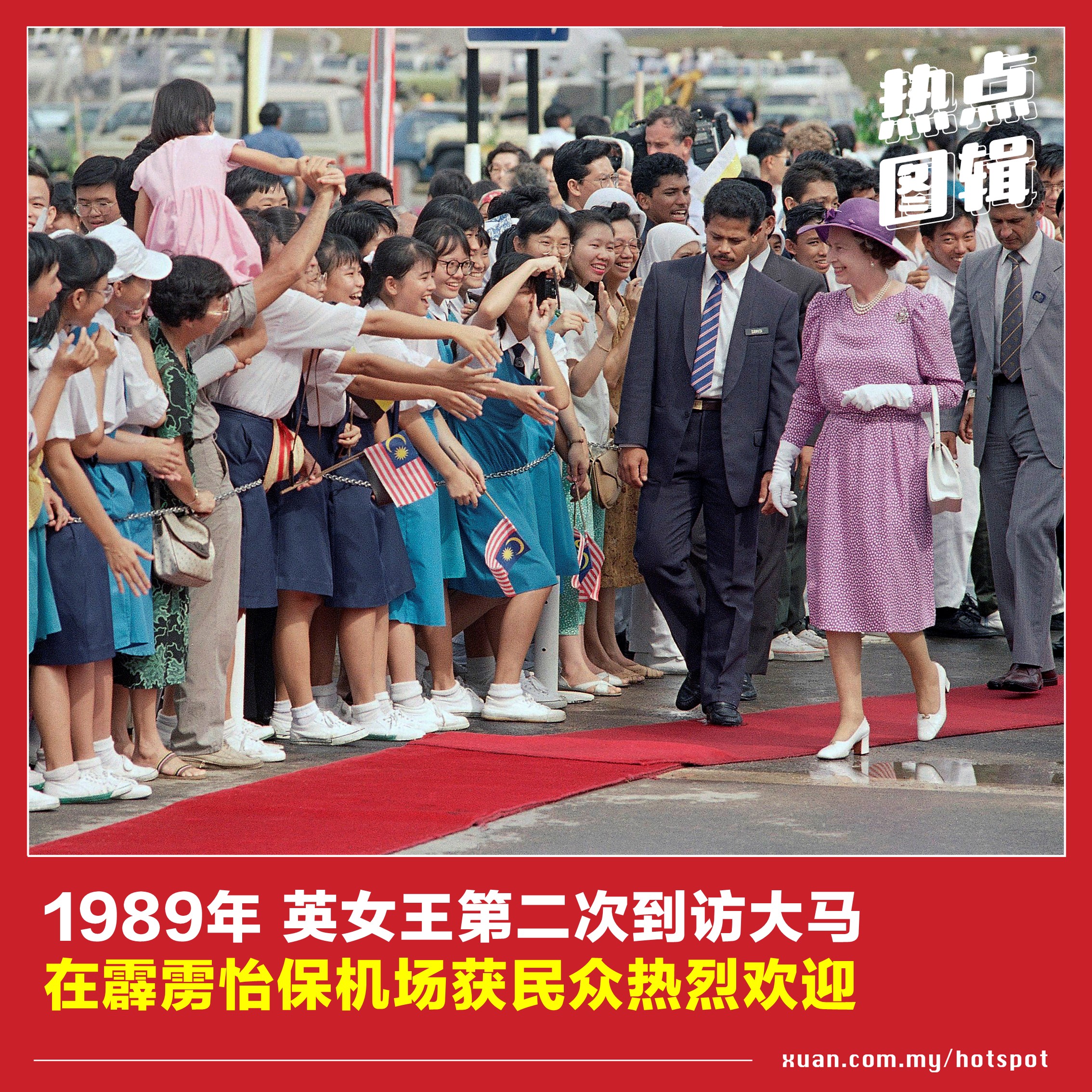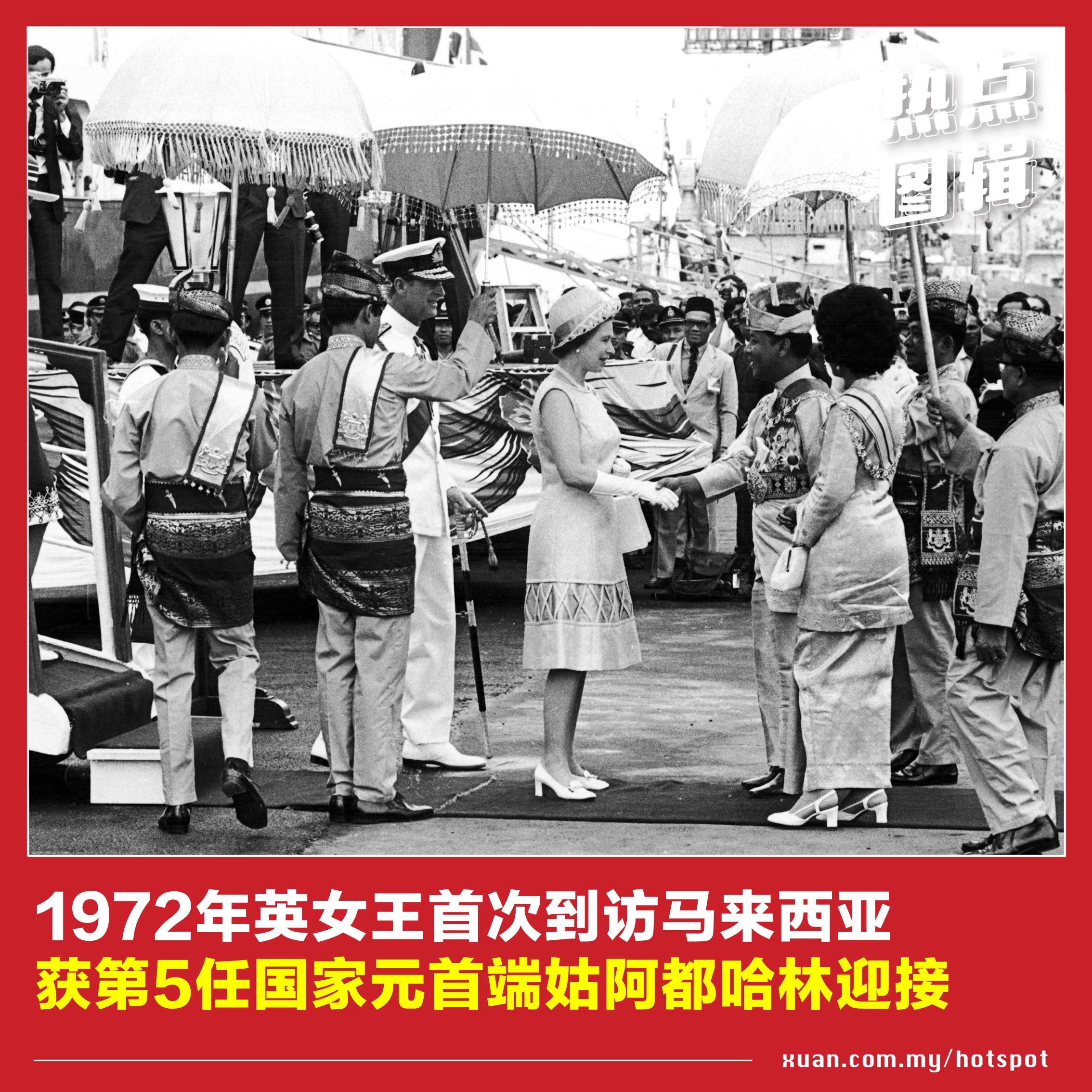英女王伊丽莎白二世曾三度访马,足迹遍布吉隆坡、槟城、马六甲和砂拉越等地。从黑白照片步入彩色照片时代,英女王也见证着大马的时代变迁。