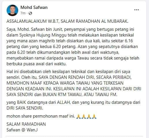 他说,真正播放的时间应该是6.20PM,这导致有份收听6.16PM黄昏祷告的部分穆斯林民众,提早了4分钟开斋。对于以上的失误,他承认是自己的问题,不是电台或有关单位的错,并诚心恳请大众原谅。
