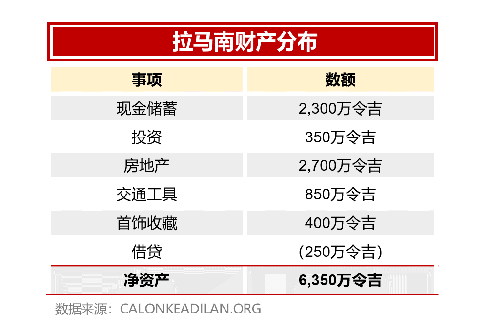 除了现有净资产之外,拉马南每个月的津贴和定期存款利息,达到了11万令吉。他也在报告中列明每个月支出6万令吉,当中包括车贷、房贷、信用卡和日常开销。