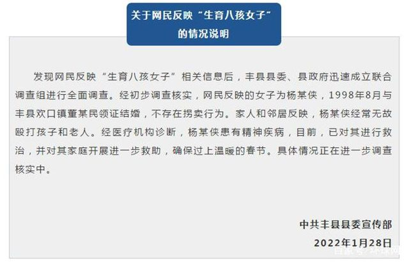 根据《BBC》报导,徐州丰县县委宣传部最初的声明称,八孩母亲名为杨某侠,患有精神疾病,在1998年8月与董志民领证结婚,不存在拐卖行为。而杨某侠被绑,是因为她经常无缘无故殴打老人和小孩。