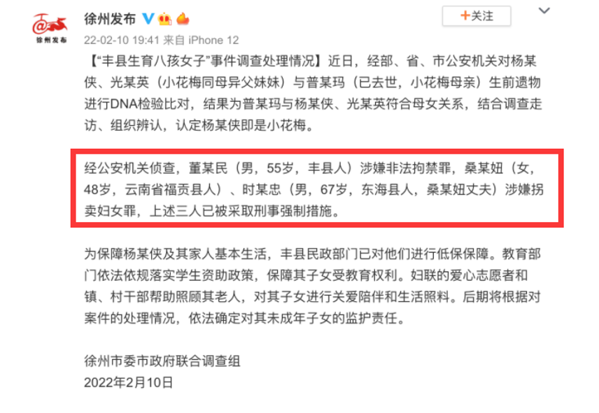 直到2月10日,徐州市委市政府调查组发出的第4份通报,终于披露确实存在拐卖行为。董志民涉嫌非法拘禁罪,桑某某和其丈夫时某忠涉嫌拐卖妇女罪,三人遭到逮捕。