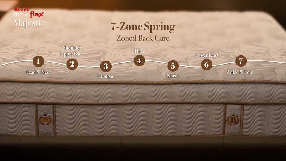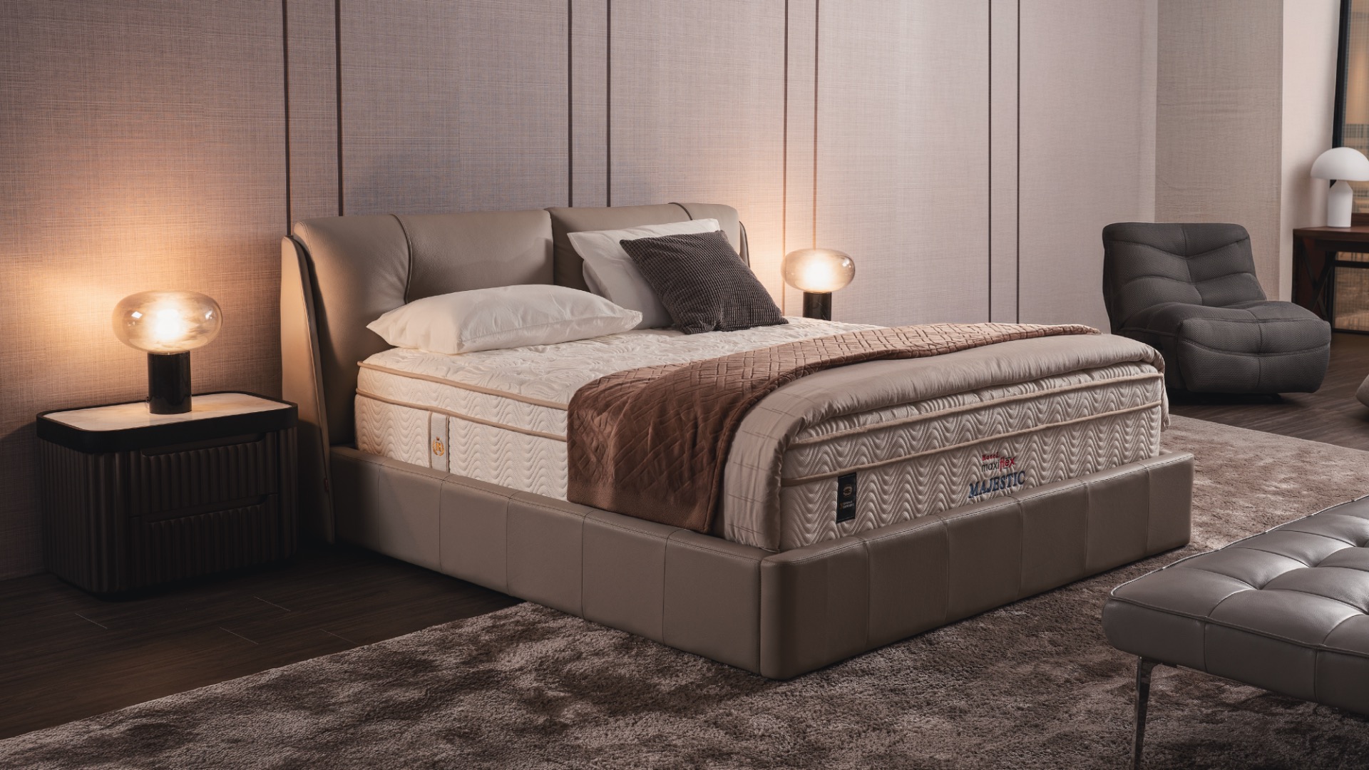 Majestic床褥内部为三重弹簧设计,从头到脚层层承托,同时搭载七区独立袋装弹簧,能因应睡姿调整支撑力,减少压迫感。