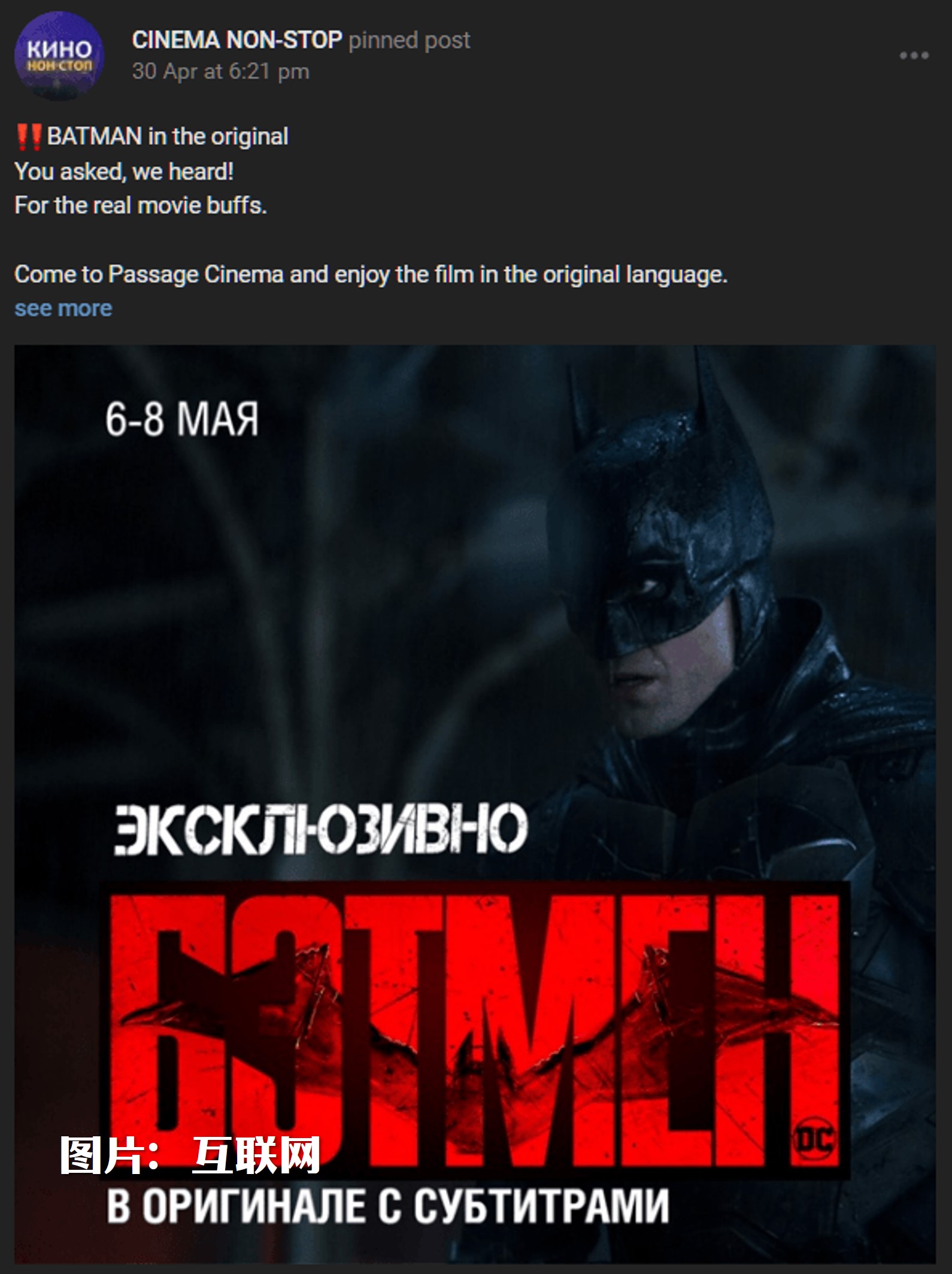 4月21日,莫斯科的WIP当代艺术中心,举行一场特别活动,播放《新蝙蝠侠》,票价约500卢布(RM29),主办单位将放映定义为“行为艺术”,作为对好莱坞离开俄罗斯市场的回应。