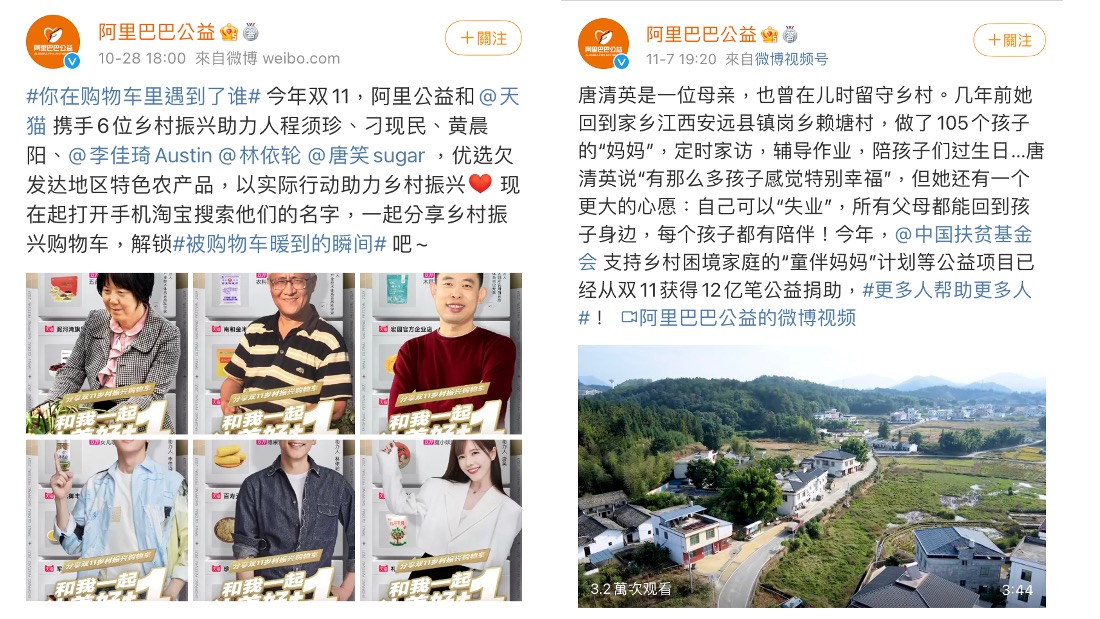 据《路透社》报道,阿里巴巴在双11购物日时推出直播,却是为了大象保护基地呼吁网友捐款。此外,阿里巴巴还针对残疾人、贫穷乡村和环保方面协助募捐。