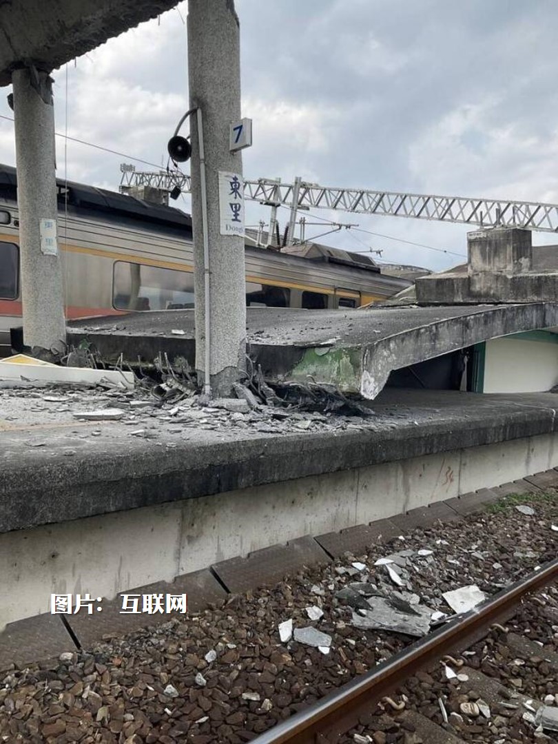 由于受到强震影响,台铁花东线东里站月台雨棚掉落,压到一辆列车(420次柴电自强号),致其出轨,有3节车厢站内倾斜,旅客约20人已离开车厢。