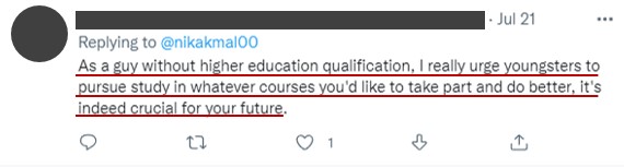 而一名因个人原因错失上大学机会的网友,也以过来人身份鼓励青少年们尽可能地上大学。他认为,在没有获取大学文凭的情况下,出社会后就要面对残酷的现实。