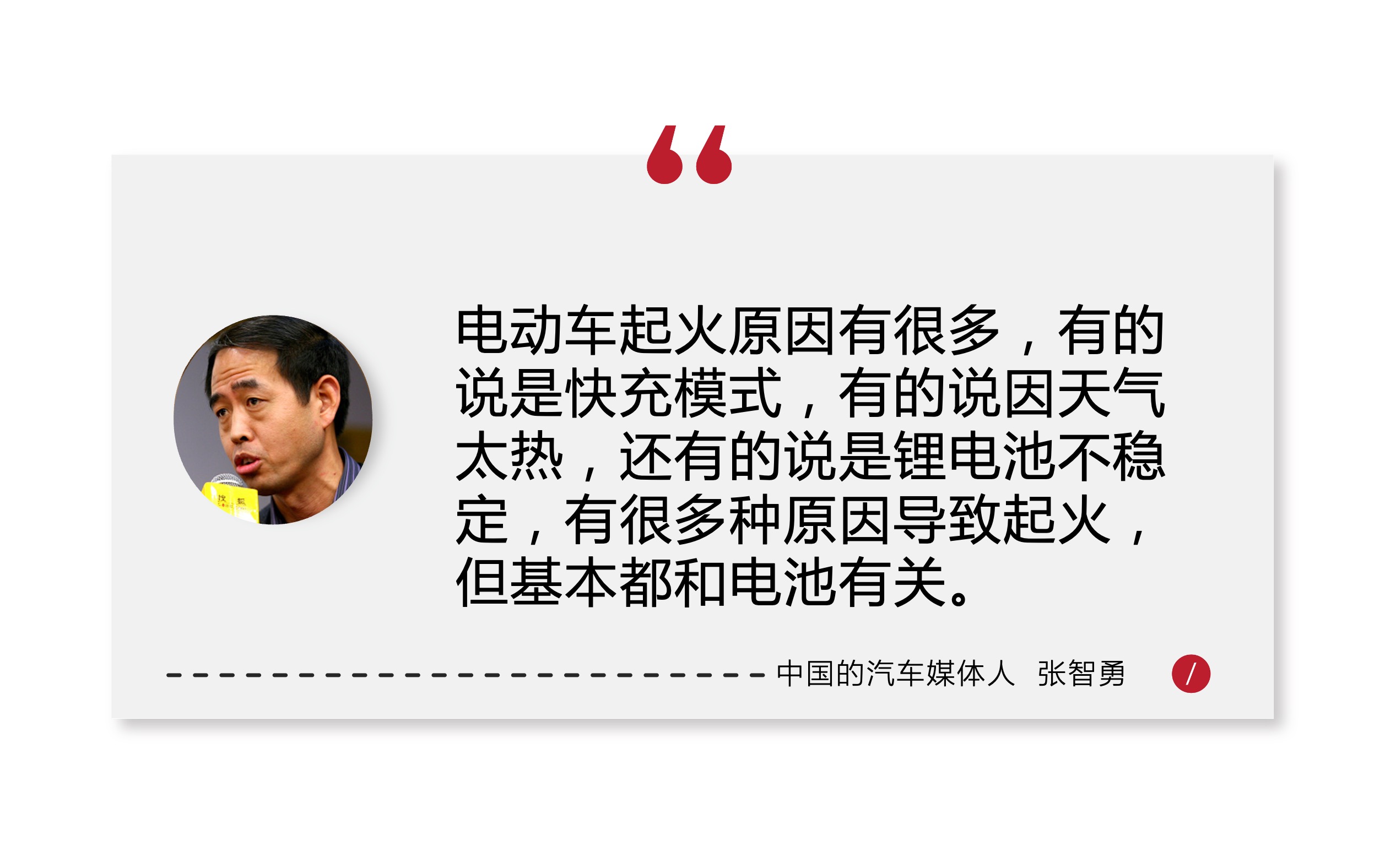 可见,电动车火灾主要为电池所致的比重大。对此,中国的汽车媒体人张智勇接受访问时表示,对此结论并不感到意外。