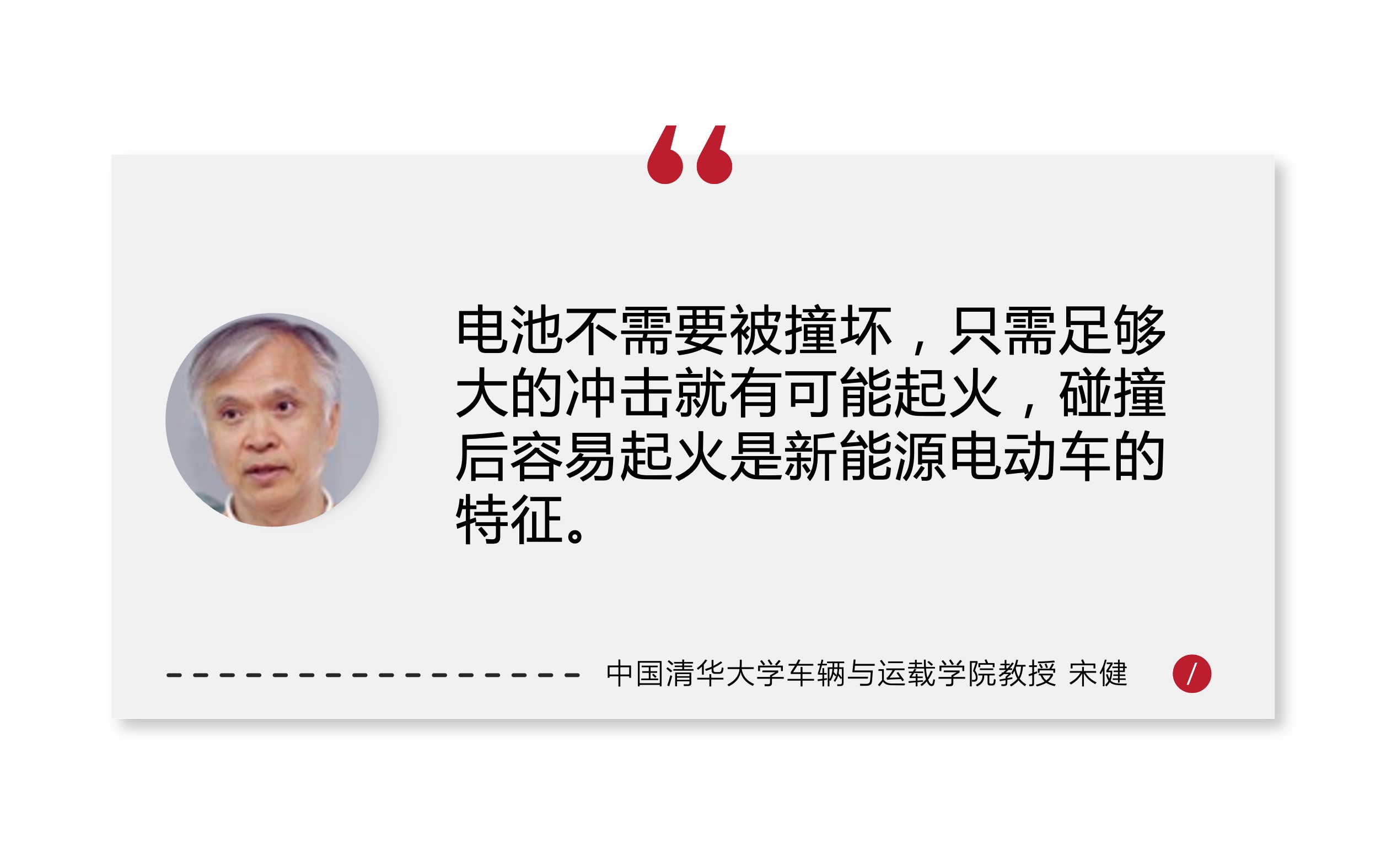 中国清华大学车辆与运载学院教授宋健告接受《时代周报》采访解释,电动车之所以在发生碰撞后,起火概率比燃油车来得大,是因为燃油车的油箱和电池的原理不同。