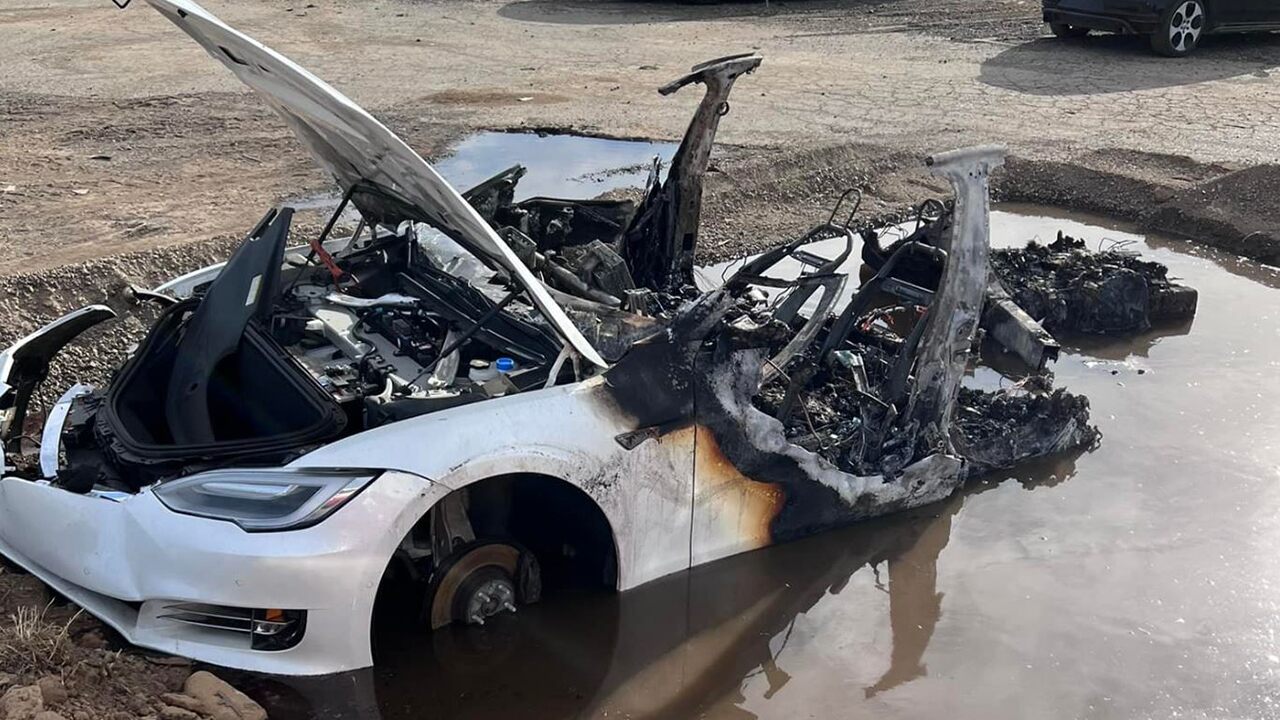 现场工作人员,最后只能挖一个坑,将车子放入坑中再用水淹没它,火势才得以扑灭。根据贴文,当局为了扑灭火势,用了将近1.7万公升的水。