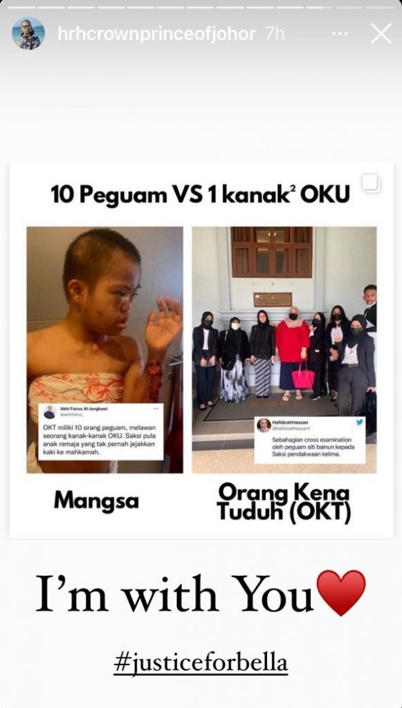 柔佛王储在Instagram限时动态中转发“10律师VS1唐氏儿”图,声援受害者贝拉。