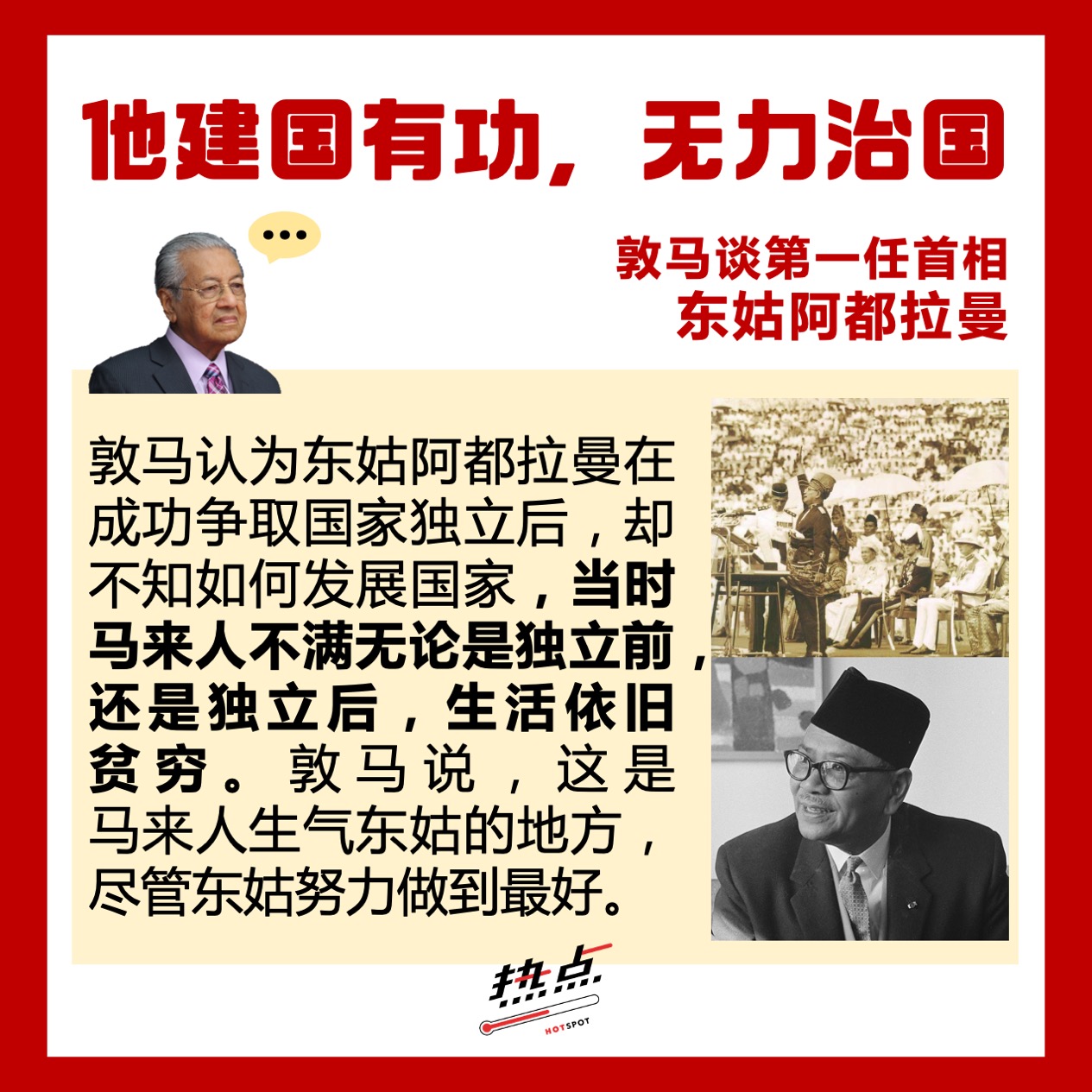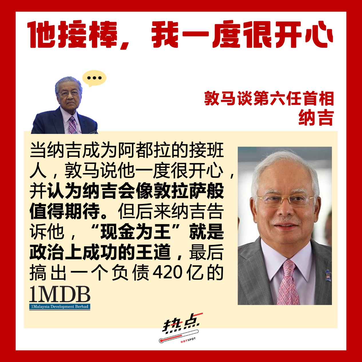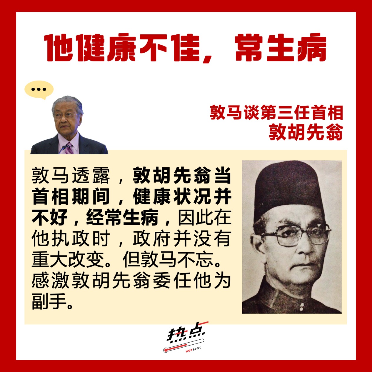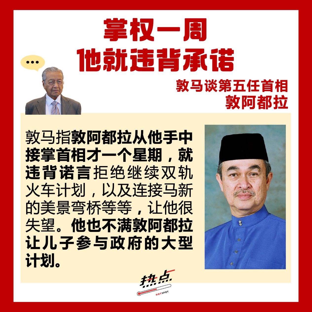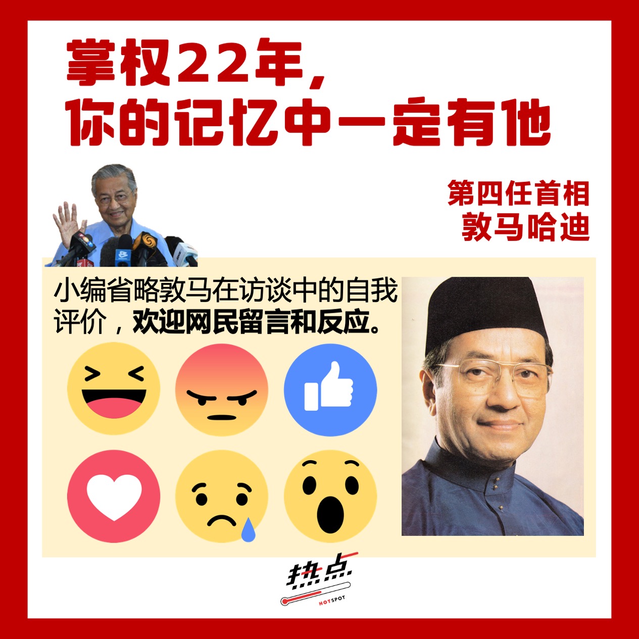 前首相马哈迪创下任期最长首相、最高龄首相、和担任二任首相的多项记录。在政坛中非常活跃,也与历任首相皆有接触与合作。不过,敦马最近在“Great People TV”的直播访问中,被问起他对我国历任首相的看法时,他的评价却多为负面。