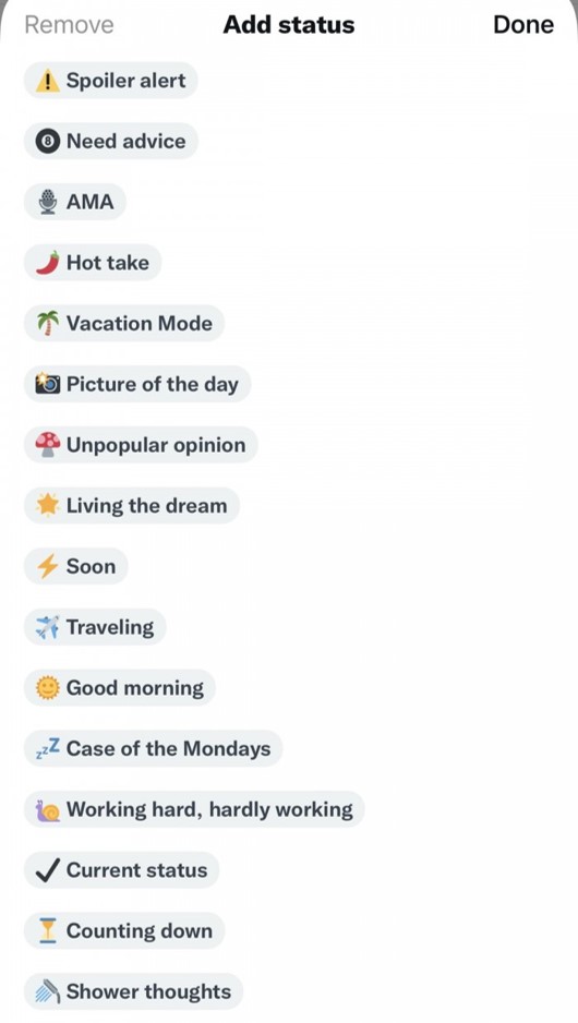 推特发言人表示,这项功能可以让用户更好地表达情绪和想法。而这些状态标签都是用户常用句子,包括“洗澡的想法”、“假期模式”及“剧透警告”等等,多达10多种状态标签供选择。