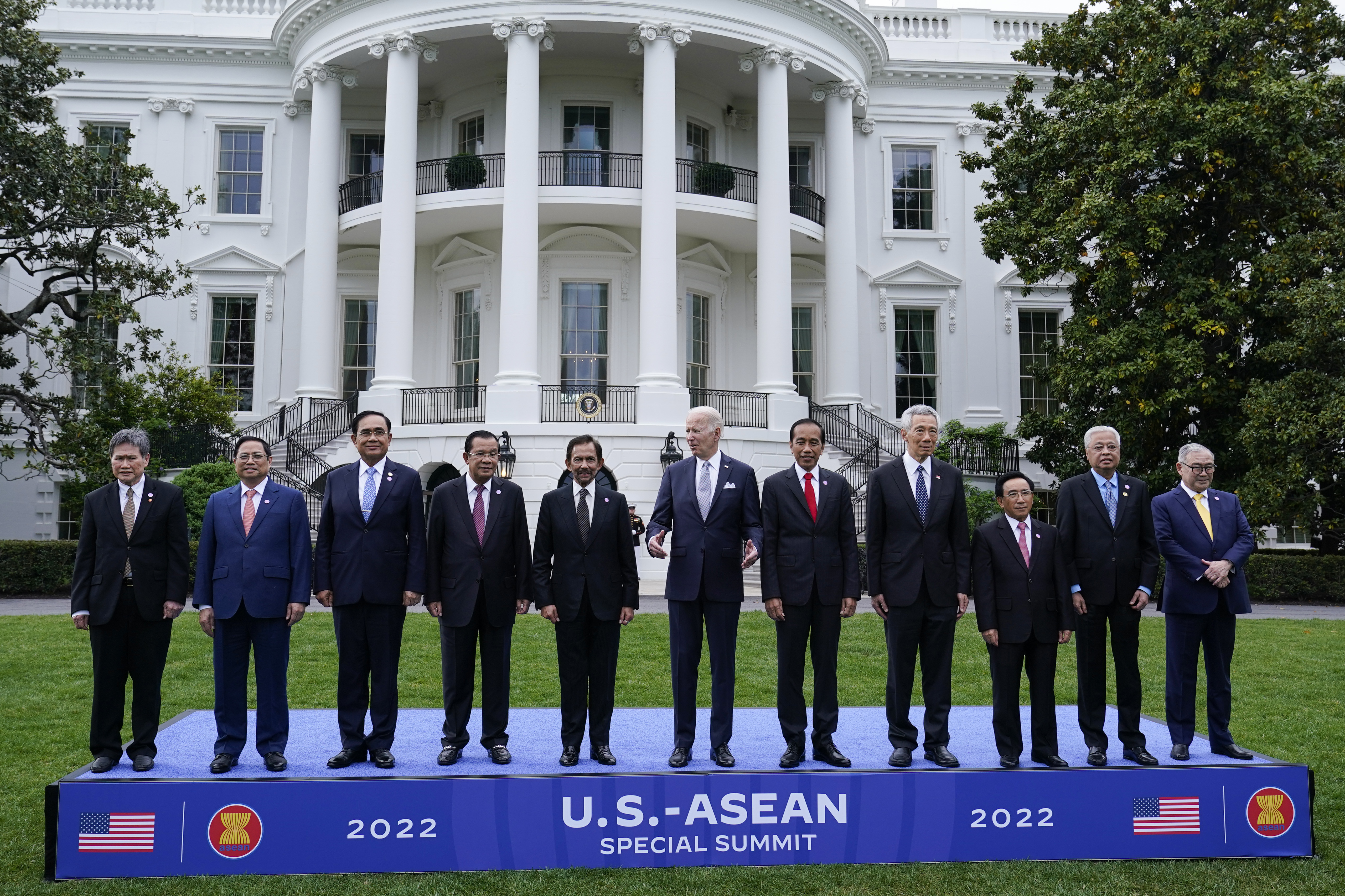 拜登在晚宴前与文莱、印尼、柬埔寨、新加坡、泰国、老挝、越南、马来西亚和菲律宾的代表在白宫南草坪上合影。