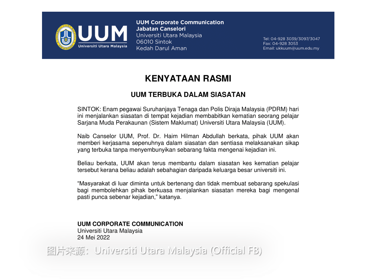对此,北方大学校长哈因希尔曼(Haim Hilman Abdullah)发文告保证,校方将全面配合调查,绝不掩盖真相。同时他也促请公众保持冷静,不要随意揣测。