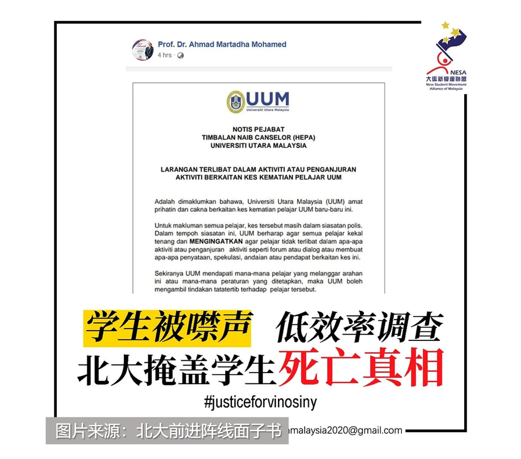 事故传开后,北大学生试图发起了#JusticeForVinosiny运动,为死者讨回公道,但却遭到校方下达“封口令”,禁止他们参与相关活动,引发学生抨击。