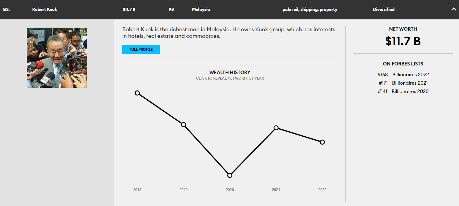 郭氏集团目前总财富为110亿美元(全球163名),相较去年的122亿美元,削减超过10亿美元。不过,郭鹤年今年继续蝉联大马首富之位。