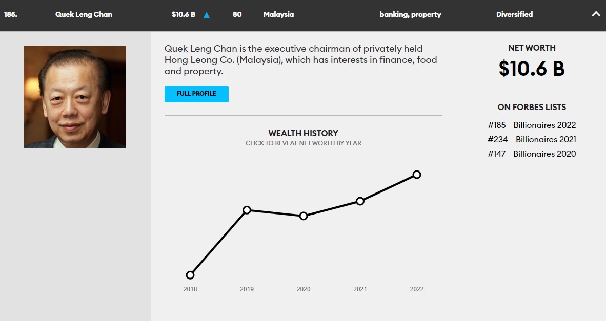 至于排在第2的丰隆集团主席郭令灿,总财富为101亿美元(全球185名),同时也是身家涨幅最多的大马富豪。同比去年的96亿美元,郭令灿的财富在一年内增加了5亿美元。