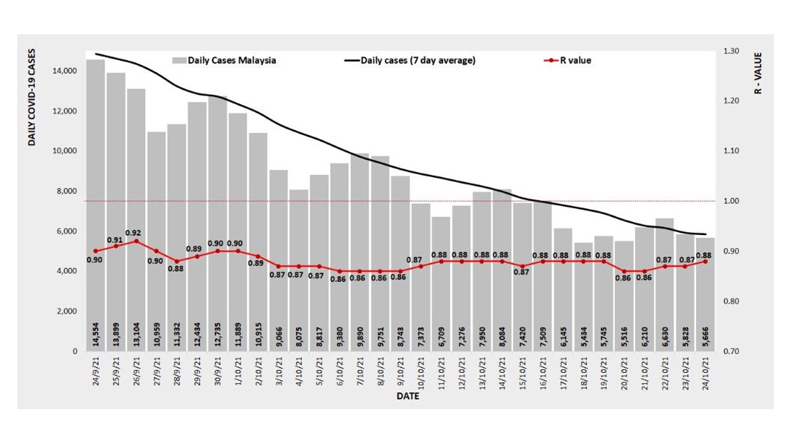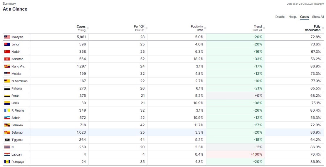 各州方面,雪兰莪在7天内(10月18日至10月24日)增加了最多的病例,平均每天增加1,023宗病例。