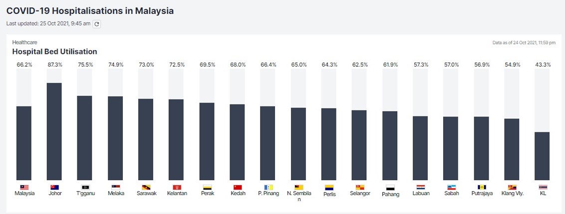 吉隆坡的病床使用率则以43.3%排在最末,不过也比前一周增加了10.4%。。一共有5州的病床使用率比前一周来得更高。