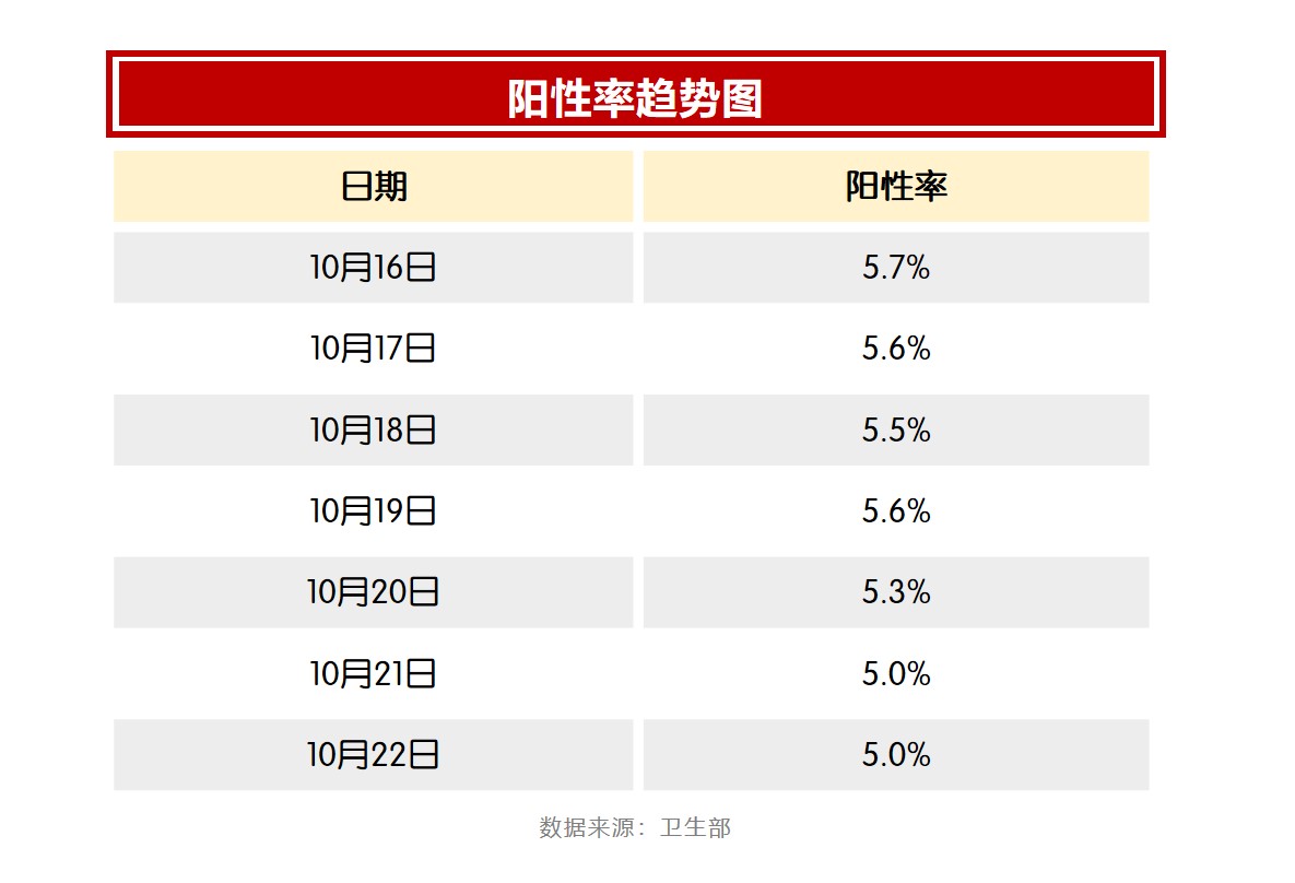根据卫生部提供的数据,10月22日阳性率为5.0%。相比一周前的(10月14日)的7.3% 阳性率来得更加低。整体而言,阳性率有都维持在5%左右。