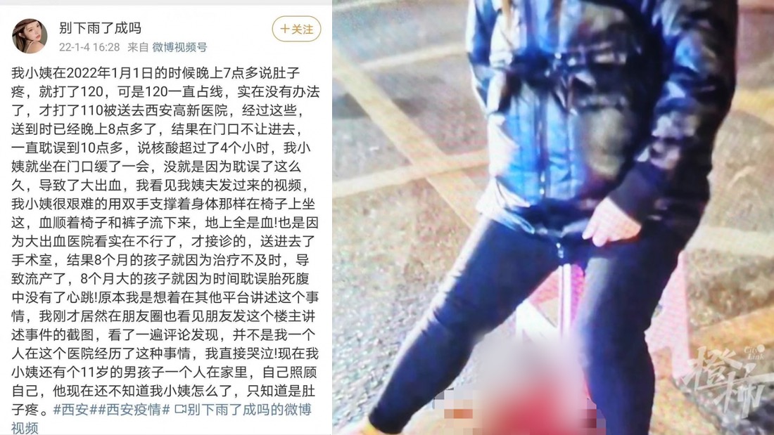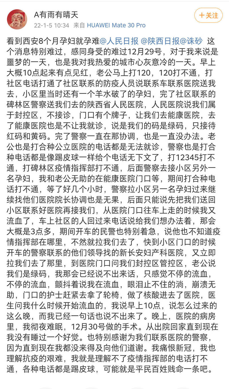 一名微博用户“A有雨有晴天”也在1月5日披露,其也是在西安封锁期间因为一码通的健康码非黄码和红码,因为被多家医院接连拒收导致流产。