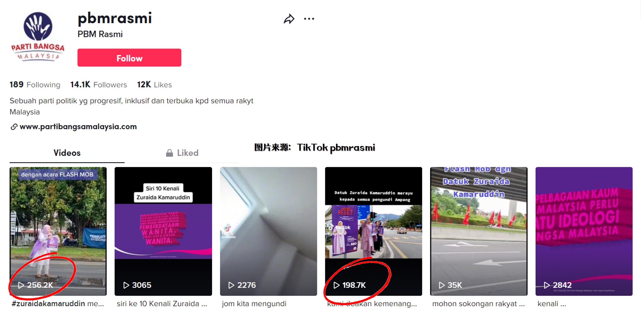 从全民党官方抖音账户“pbmrasmi”上载的视频可以发现,一群身穿紫色马来服装的女性们,拿着全民党旗帜和祖莱达的横幅,站在马路旁招手。