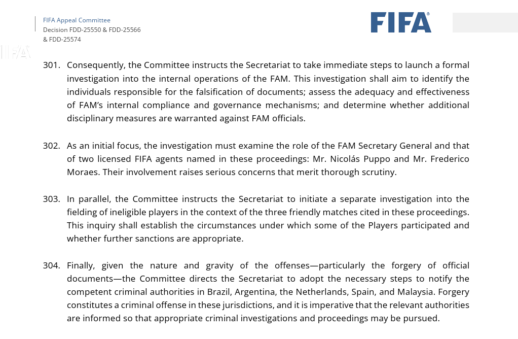 国际足联上诉委员会表示,鉴于事态严重,且伪造官方文件属刑事罪行,因此当局将指示秘书处通知巴西、阿根廷、荷兰、西班牙与大马的相关当局,以启动适当的刑事调查与程序。