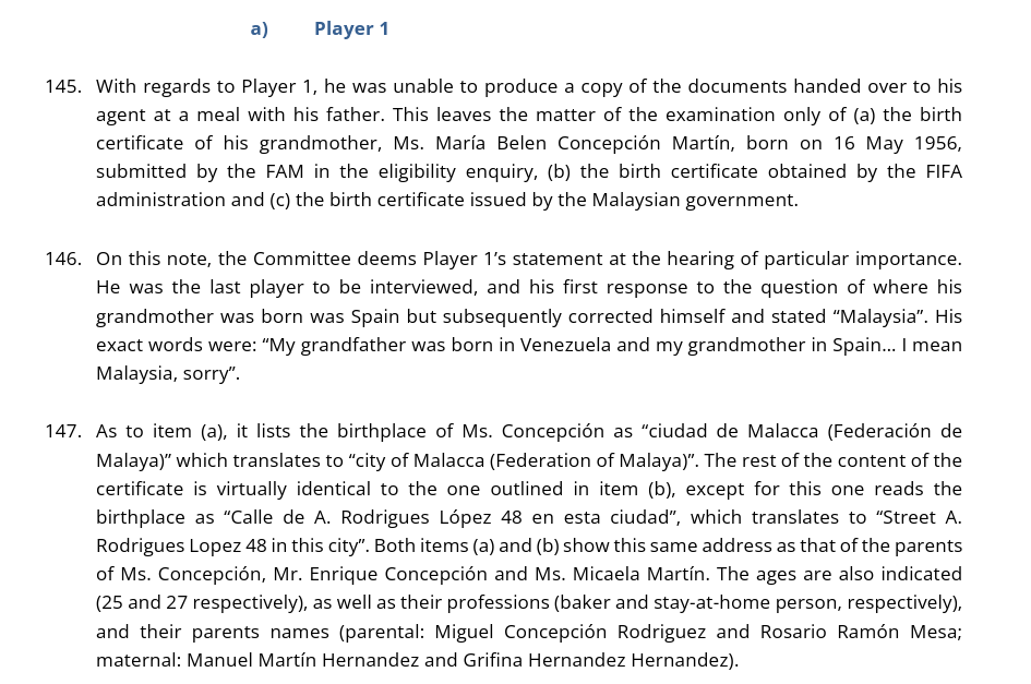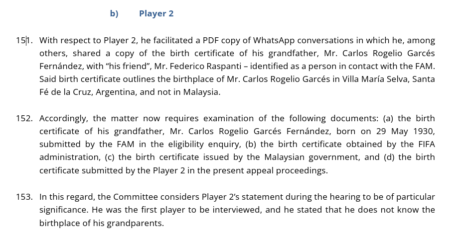 另一方面,上诉委员会还在文件中揭露,当委员询及归化球员们祖父母的出生地时,球员们的口供矛盾。