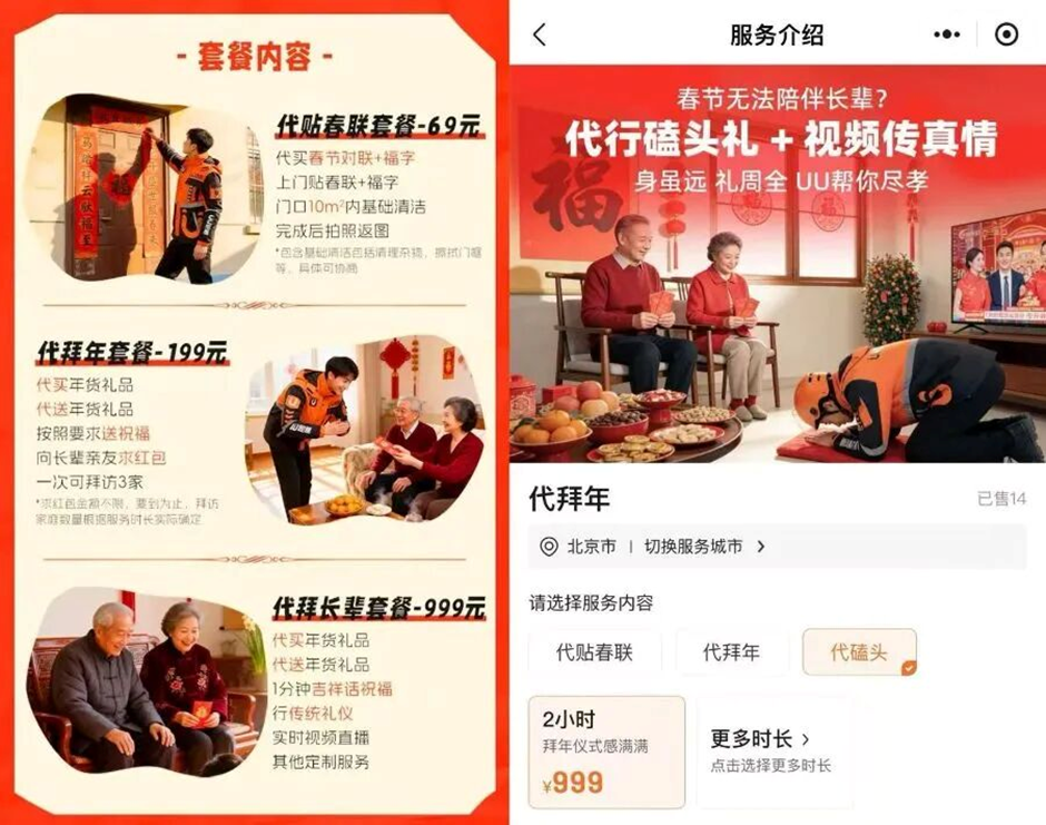 根据详细的套餐内容指出,跑腿员会在现场开启视频直播,让远在外地的客户通过手机屏幕,亲眼看着跑腿员当场跪下“代磕头“,替自己向家里的长辈行跪拜大礼。整个拜年流程长达两小时,主打一个“仪式感拉满”。