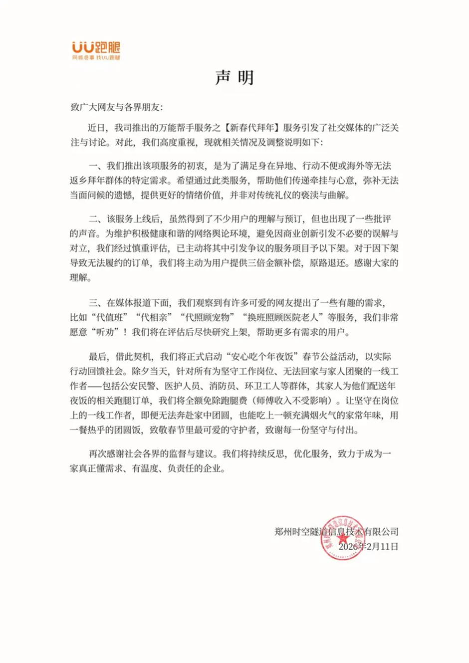不过眼看争议声持续升温,UU跑腿在2月11日紧急发声,强调推出该服务的初衷是想帮身在异地的游子传递心意,并没有要亵渎传统。