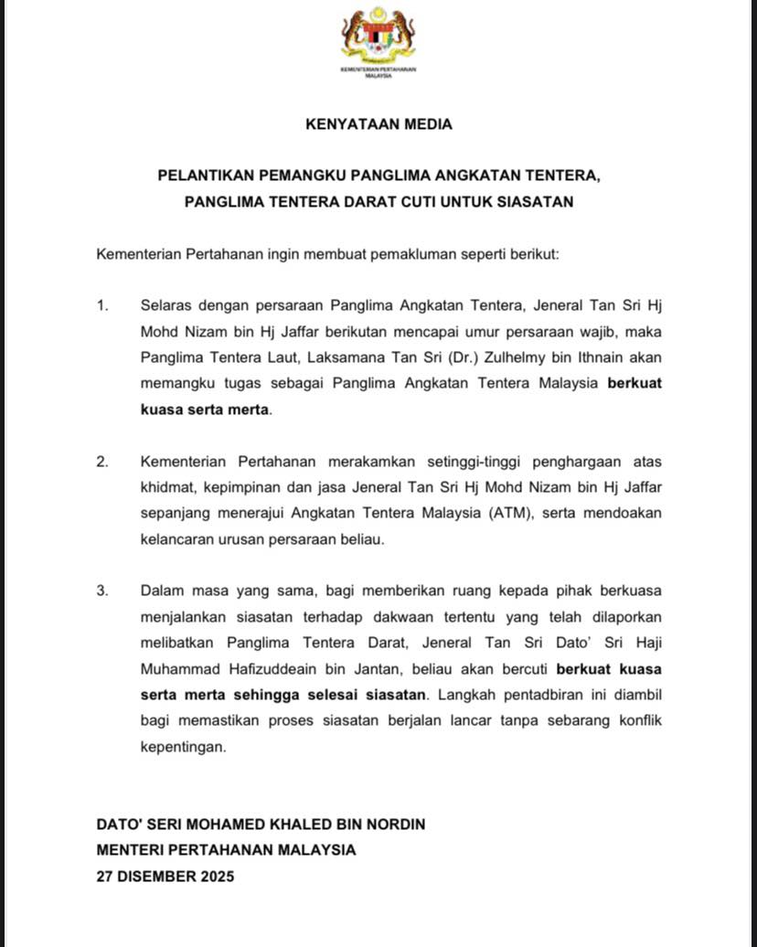 国防部长莫哈末卡立诺丁今天发文告表示,此举是为了确保调查工作能够顺利进行,以及避免任何利益冲突,同时为当局展开全面调查提供空间。