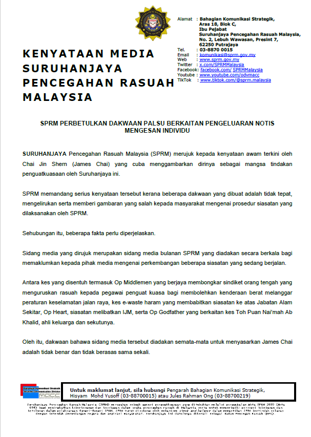 反贪会否认其近期发出的“寻人通知”是针对前经济部长拉菲兹的昔日助理蔡镇燊(James Chai),并强调相关措施只是标准调查程序,呼吁对方尽快出面配合调查。