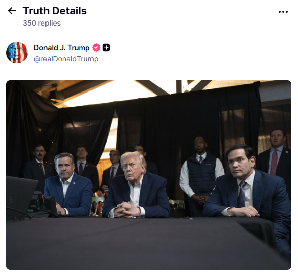 根据特朗普发布的照片显示,他与数位高级官员在佛罗里达州的海湖庄园,密切关注整个军事行动。