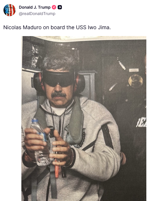 特朗普稍后在社群平台Truth Social,释出一张马杜罗身穿灰色衣服、戴着眼罩与手铐的照片,指他在美军的“硫磺岛号” (USS Iwo Jima) 两栖攻击舰。